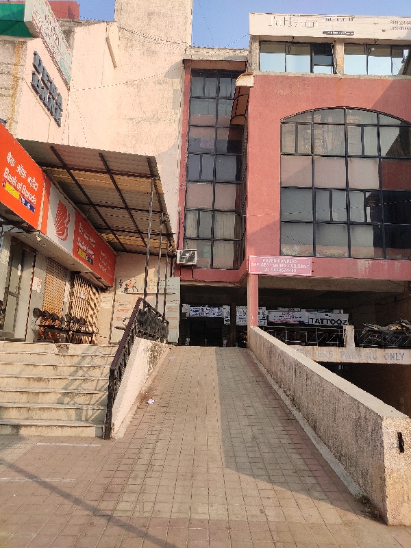 The building has stairs with railing and has a ramp, but does not have proper railing for the ramp.
